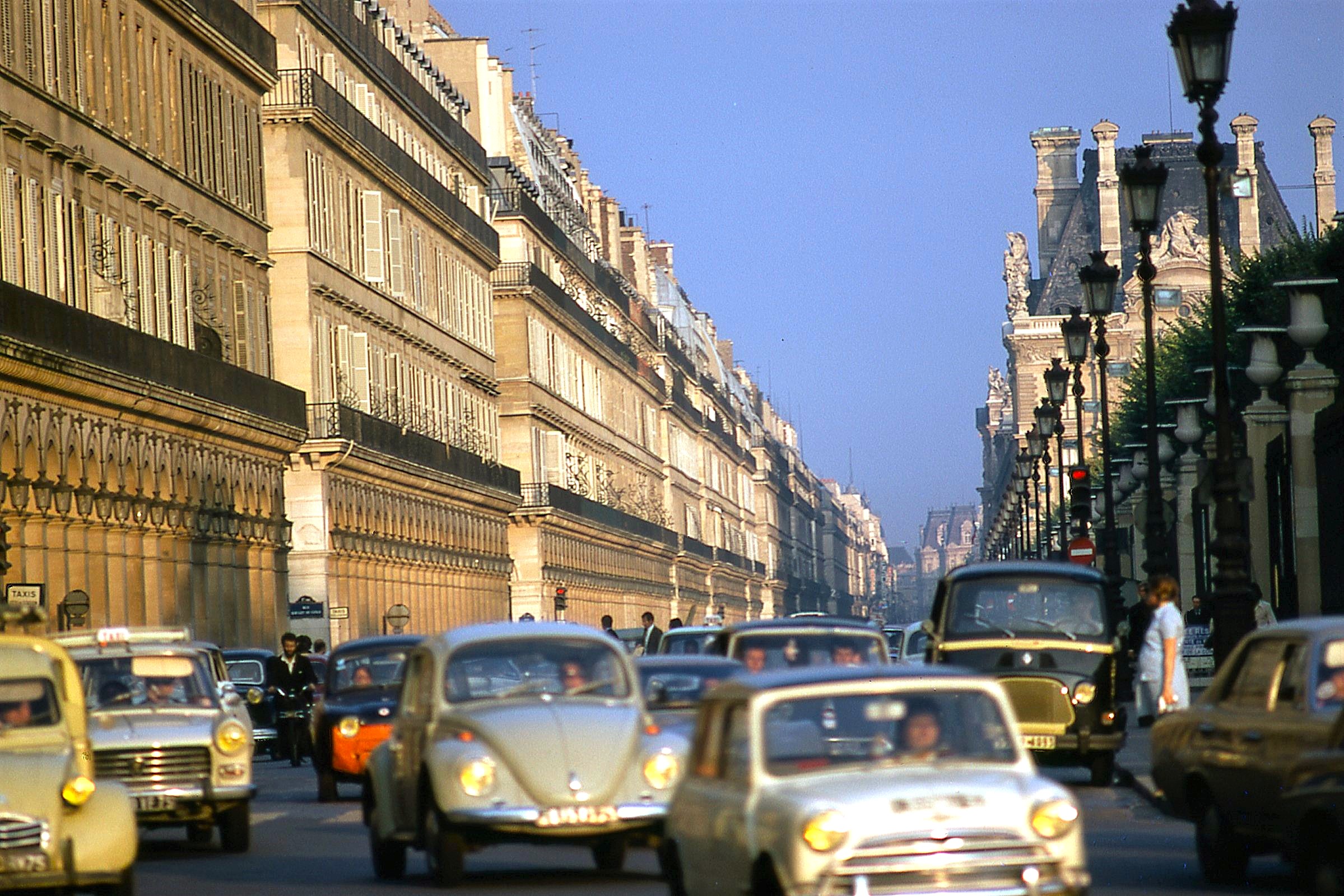 Rue Rivoli in Paris in 1970: I was 17 years old, and I had purchased a Eurorail train pass to tour most of Western Europe using my travel guide, "Europe on $10 per day." I have since been to Paris perhaps 200 more times. It's the most beautiful city in the world - by far! The shot has vintage colors, and the classic Paris buildings and autos from the period give me a strong nostalgic feeling of the post-WWII era in Europe. I recall it like it was just yesterday. And I miss it.